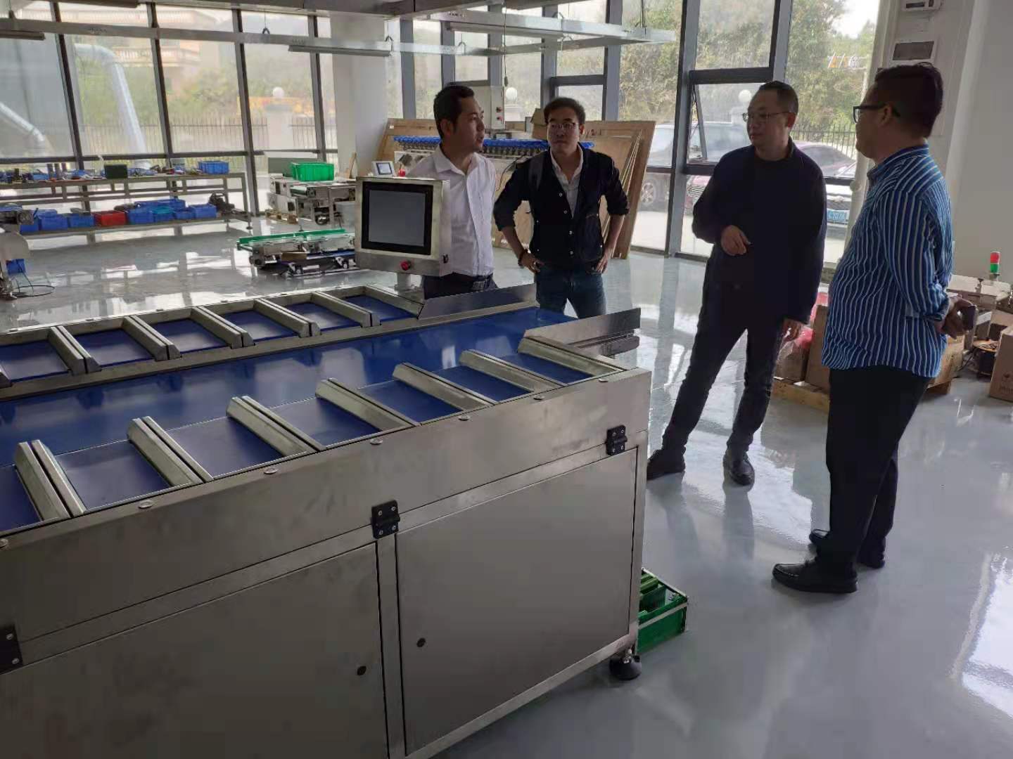 經(jīng)過自動配重秤時(shí),梁秘打量了下,問這大塊頭這么多個(gè)分區(qū)是有什么用途呢?李總說,“這是我司這幾年研發(fā)設(shè)計(jì)的DHPZ系列配重秤,在預(yù)包裝過程中,用于產(chǎn)品按目標(biāo)重量、數(shù)量組合出料的設(shè)備,一般和包裝機(jī)做配套,多應(yīng)用于果蔬生鮮、水產(chǎn)、禽肉、休閑零食等行業(yè)?!绷好乇硎?,用途很廣泛,想不到這設(shè)備有這么重要的作用。